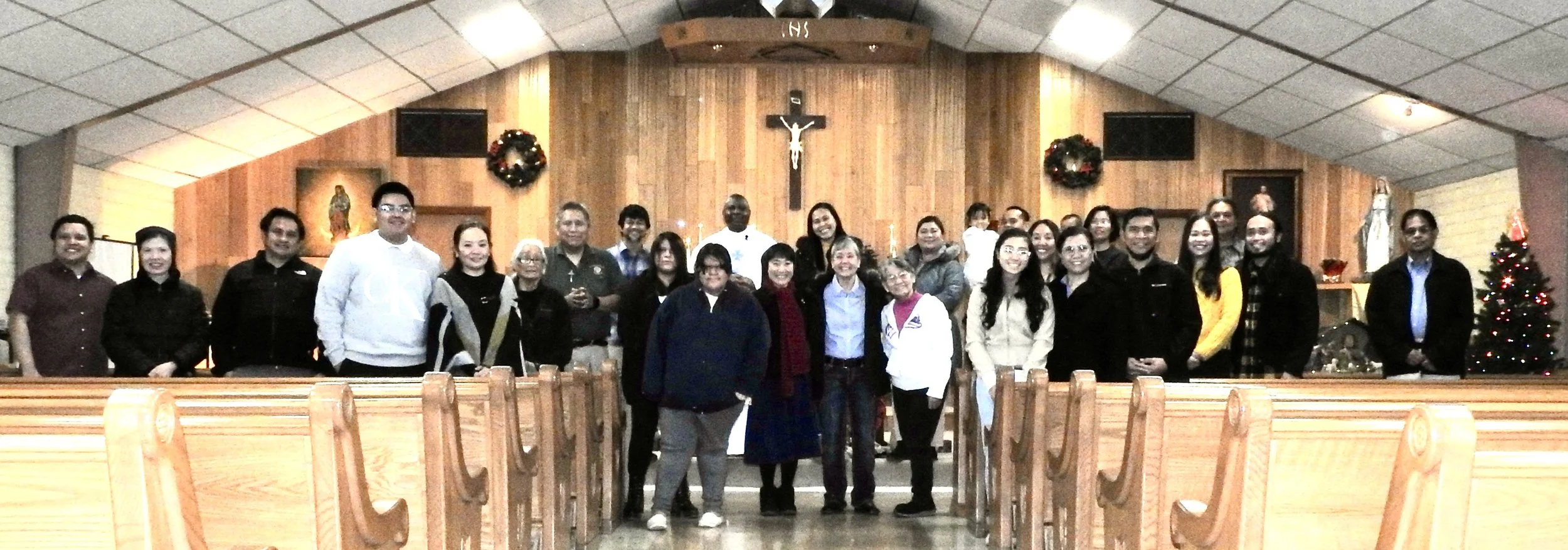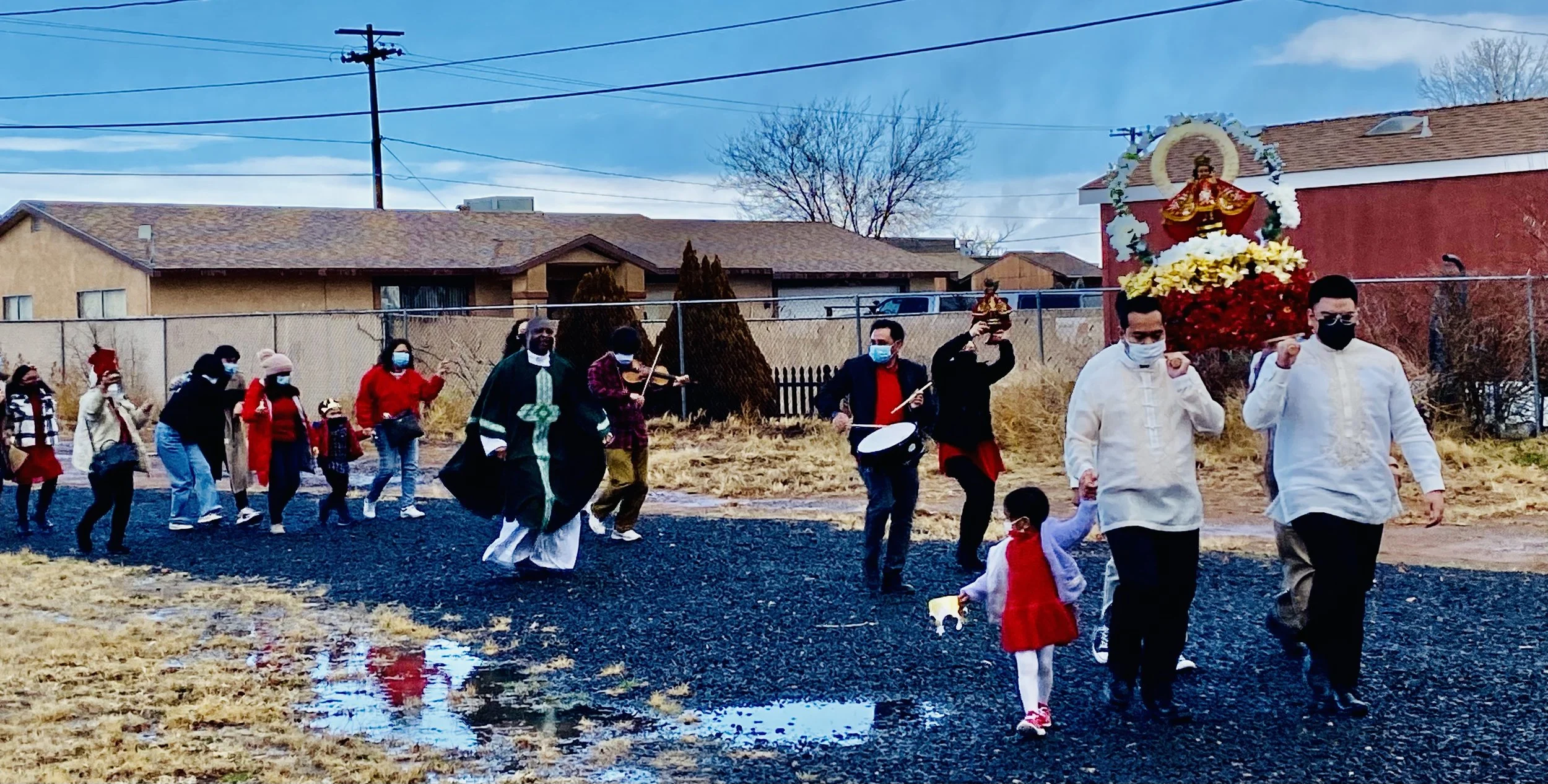 Santa Niño - After a 2 -year pause due to the COVID pandemic, the Filipino families of St. Jude Parish joyously gathered for the Santa Niño Mass and celebration with festive music and dance, followed by a sumptuous feast held in the Parish Gym on January 15, 2023. It was a snowy and rainy day. Praise and thanksgiving to God that Fr. Faustinus was able to come back from Kayenta to celebrate the Mass, and the snow and the rain stopped for the procession and dance from the church to the gym!!!